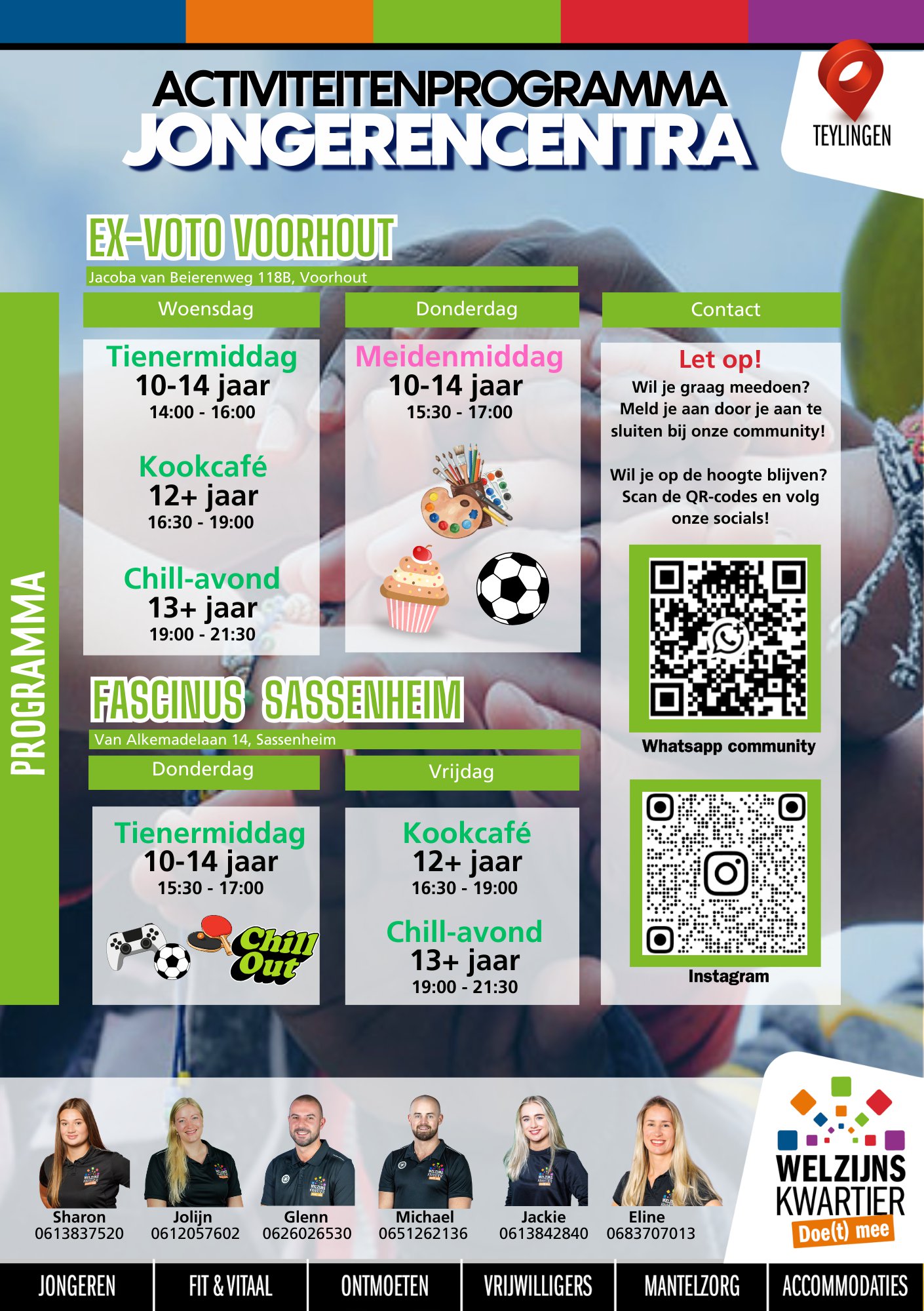 In de gemeente Teylingen verzorgt Welzijnskwartier het jongerenwerk. Dat doen we op (de digitale) straat, op school en in jongerencentra Fascinus en Ex-Voto. Daar ontmoeten jongeren tussen 10 en 27 jaar elkaar tijdens kookworkshops, meidenmiddagen, game-avonden en voor een luisterend oor.